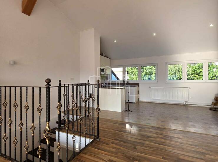Kuća je 77 m2 u osnovi, a neto površina 237 m2 prostire se na četiri etaže. Veliki ulazni hodnik sa hobi sobom će vas dočekati na ulazu. Na prvom spratu su veliki dnevni boravak sa lošom, te komotna kuhinja s trpezarijom i izlazom u baštu cca 30 m2. Na drugom spratu su tri spavaće sobe od kojih jedna s balkonom, a posljednja etaža je impozantan prostor u komadu sa visokim stropovima i velikim kliznim otvorima s obje strane. Dodatni spavaći prostor, atelje, igraona, kino... Šta vam volja....