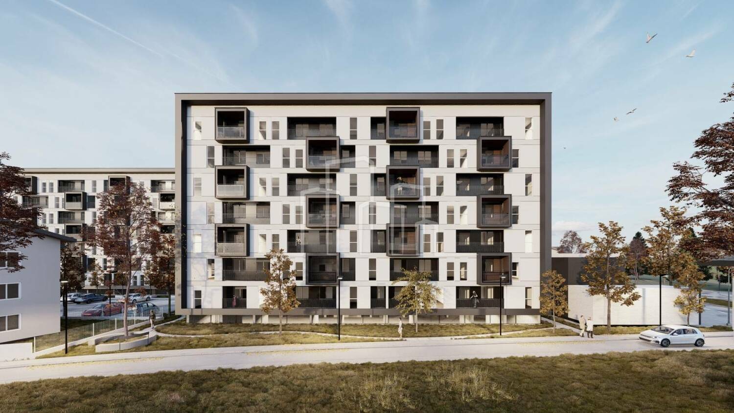 Naselje u kojem se nalaze predmetni stanovi će se sastojat iz 3 zgrade,sa preko 200 stanova i sklopu svakog objekta se nalaze garažna parking mjesta kao i vanjska privatna parking mjesta. Sve etaže su povezane liftom i stepeništem.