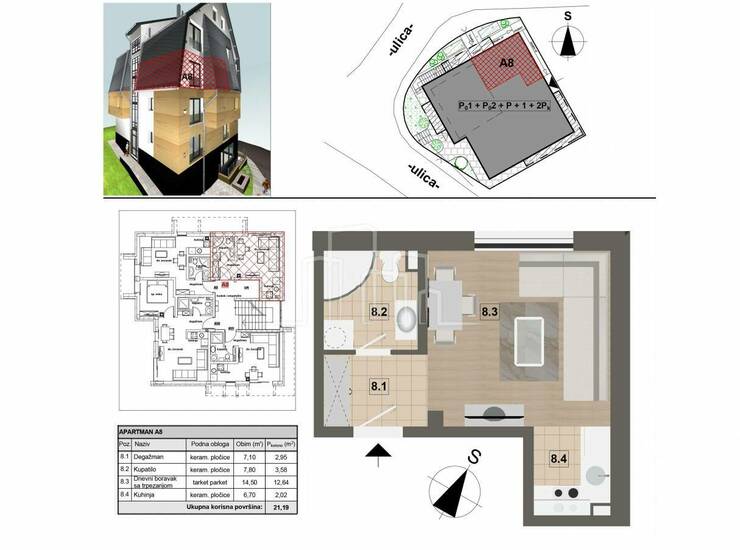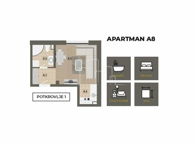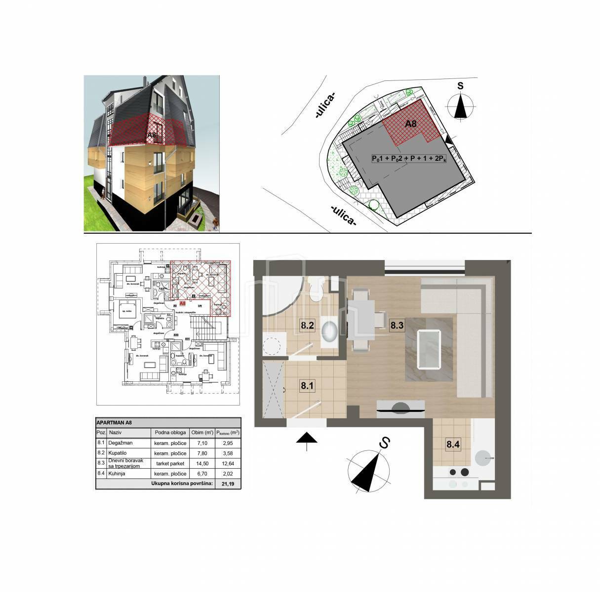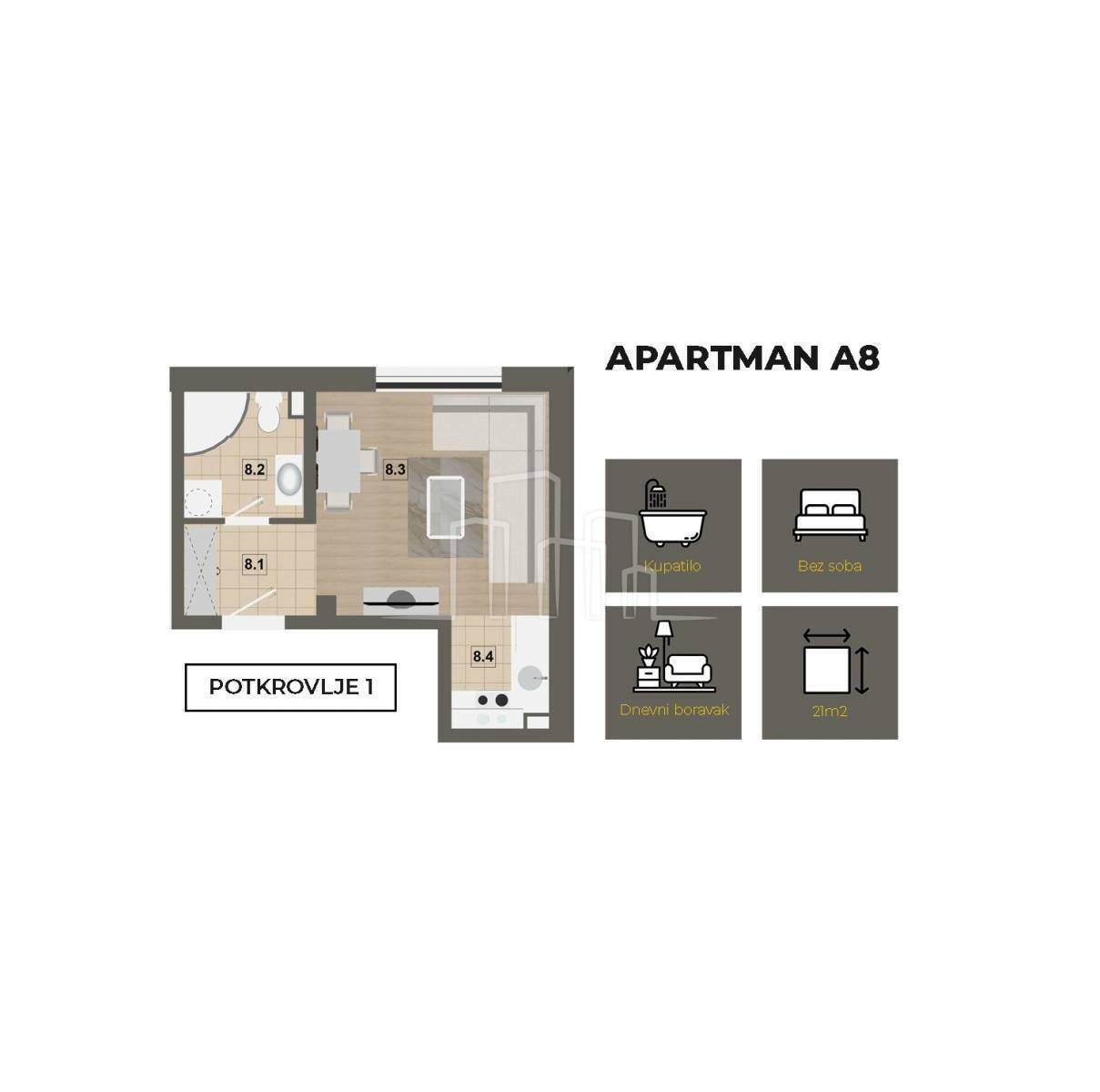 Apartman koji Vam predstavljamo nosi naziv APARTMAN A8 i sastoji se od degažmana, kupatila, dnevnog boravka s trpezarijom i kuhinjom ukupne površine 21.19m2 i nalazi se na 2. spratu zgrade sa liftom.