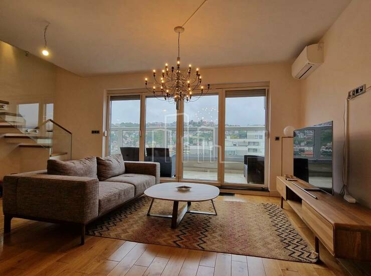 Stan se nalazi na 12.spratu zgrade sa dva lifta i čine ga ulazni hodnik, stepenište,veliko kupatilo, toalet, četiri spavaće sobe, trpezarija, kuhinja, prostrani dnevni boravak sa izlazom na balkon koji pruža prelijep pogled.