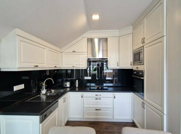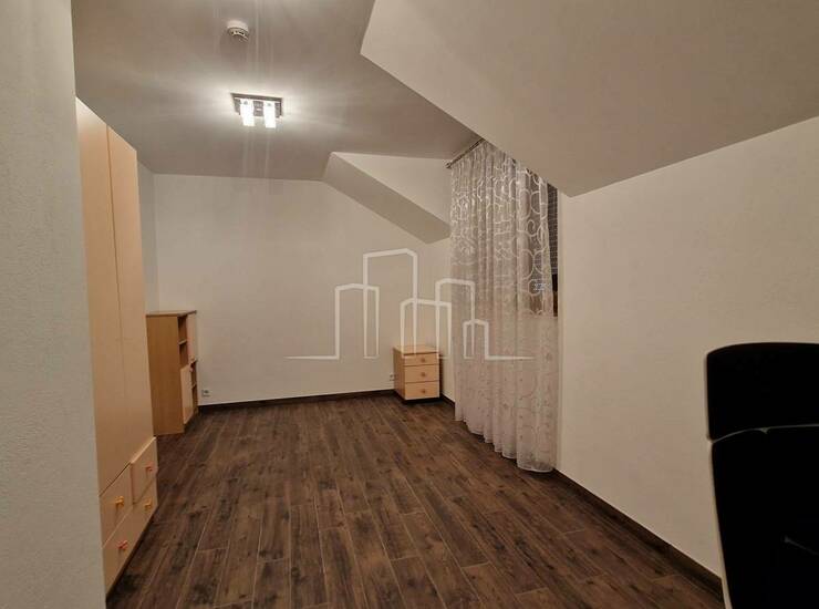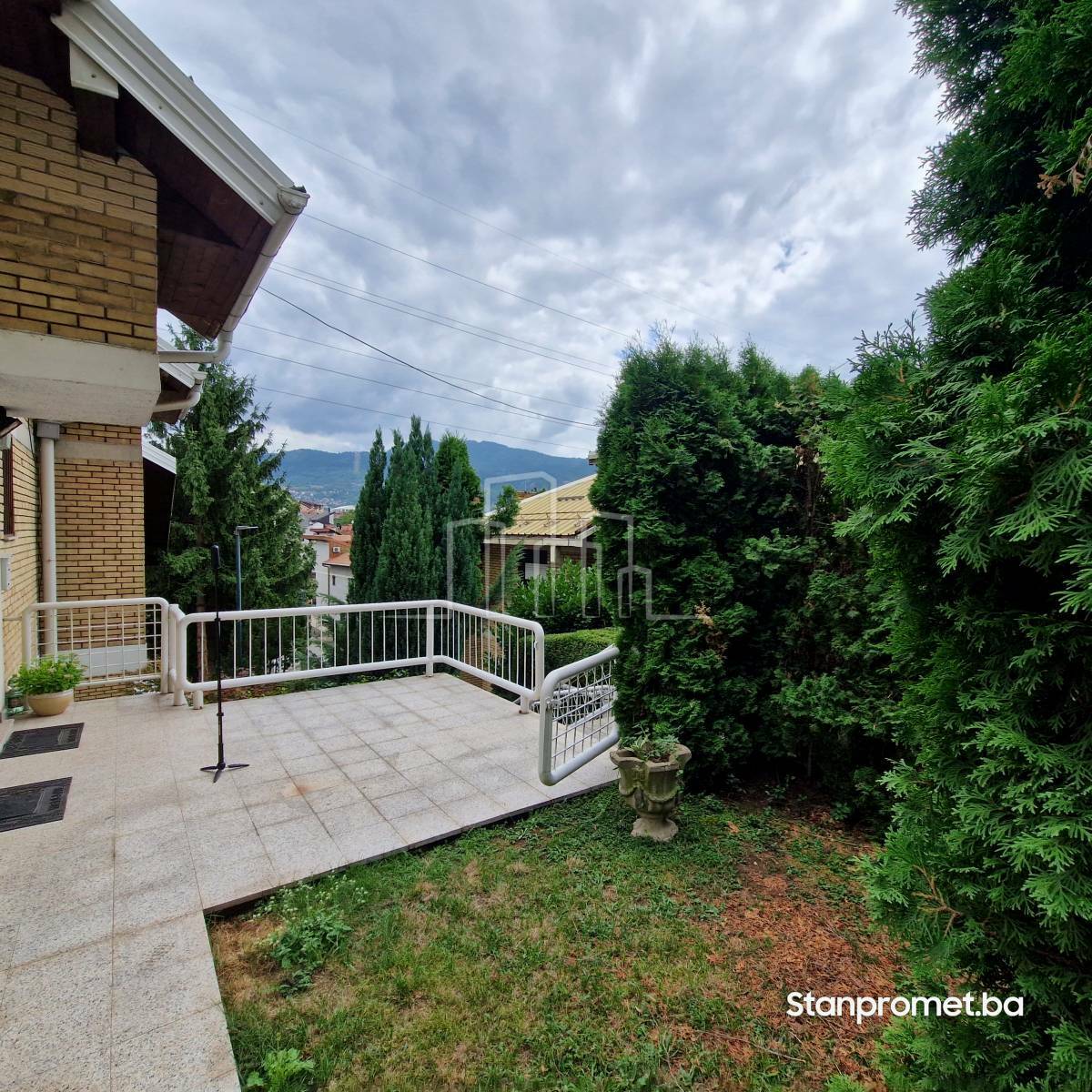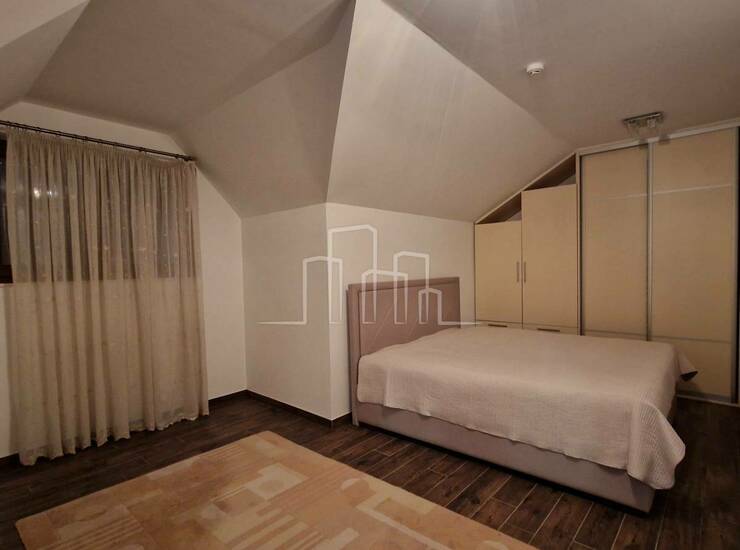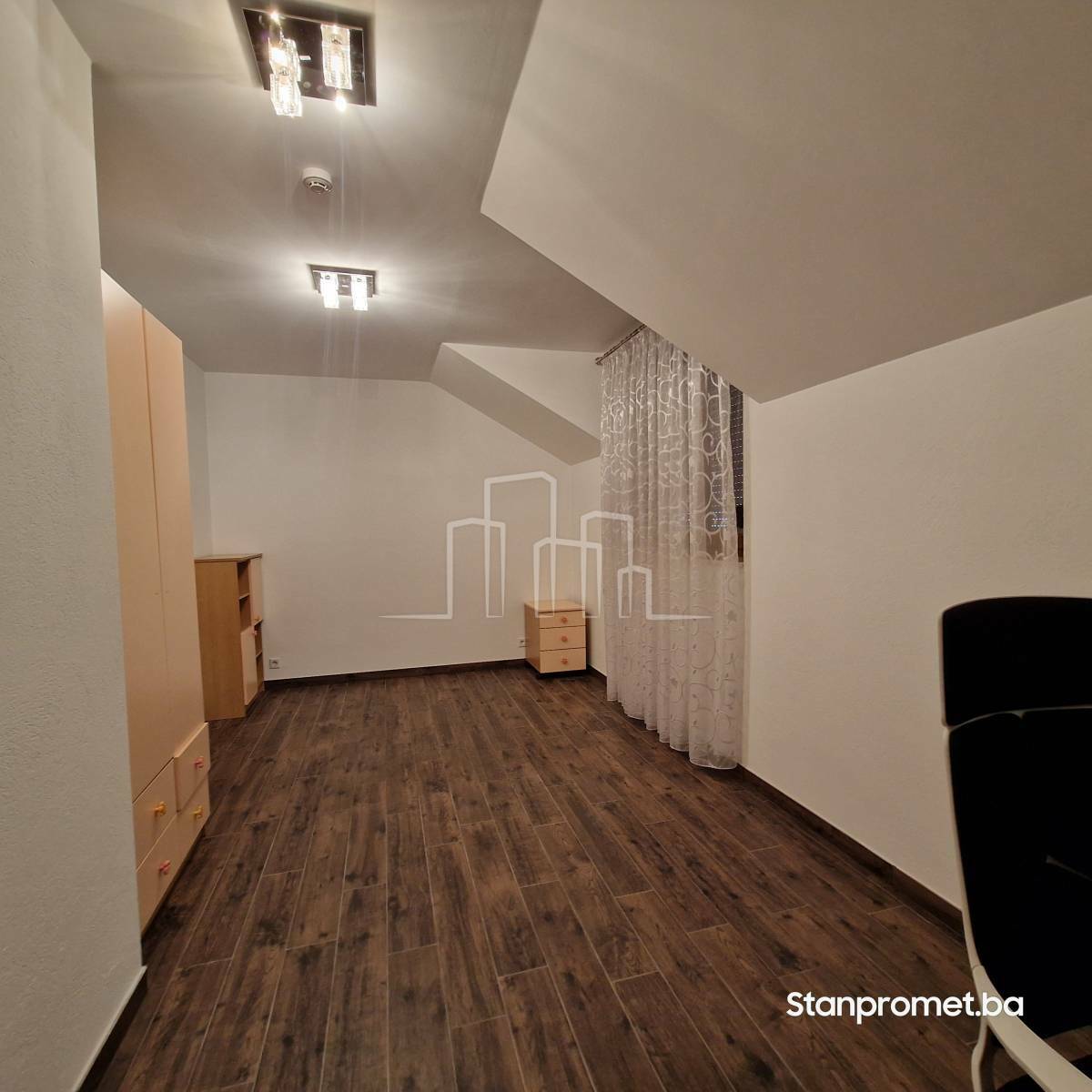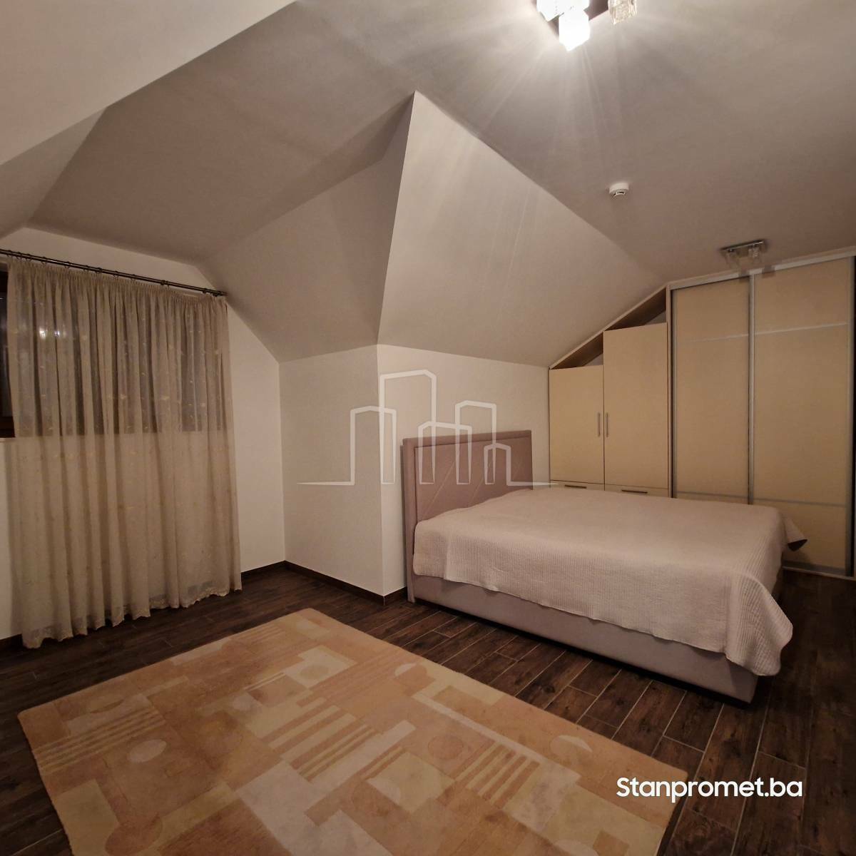 Stan je podjeljen de facto i de iure na dvije zasebne jedinice, no jednim zahvatom postaje kuća na dva sprata. Nekretnina je smještena na vrhu kaskadnih nizova, te predstavlja jednu od najatraktivnijih lokacija za porodicu u gradu. U prizemlju je stan na četiri spavaće, prirodno podijeljen na dvije logične cijeline. Na ulazu je prostor za veliki plakar, gostinjsko kupatilo te mala tehnička prostorija. Desno degažman vodi prema četiri spavaće sobe i kupatilu, dok su pravo impozantan dnevni boravak sa trpezarijom, velika kuhinja, te izlaz na terasu sa pogledom prema naselju. Gornji stan je četverosoban, sa velikim open space prostorom, lođom, jednim gostinjskim kupatilom, kao i jednom master spavaćom sobom sa vlastitim kupatilom.